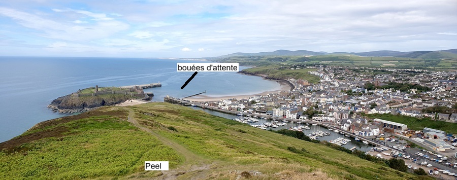 Départ matinal pour 14 heures de navigation vers Peel sur L'île de Man où l'on trouve des bouées pas bien abritées par la digue en cas de houle du nord mais qui permettent d'attendre l'ouverture de la porte du port. Visite de l'île en bus et à pied : Douglass, Ramsey, Saint-Mary, Saint-Erin (où un mouillage peut-être une option avant de continuer vers le sud sans être conditionné par les heures d'ouverture de la porte du port de Peel.