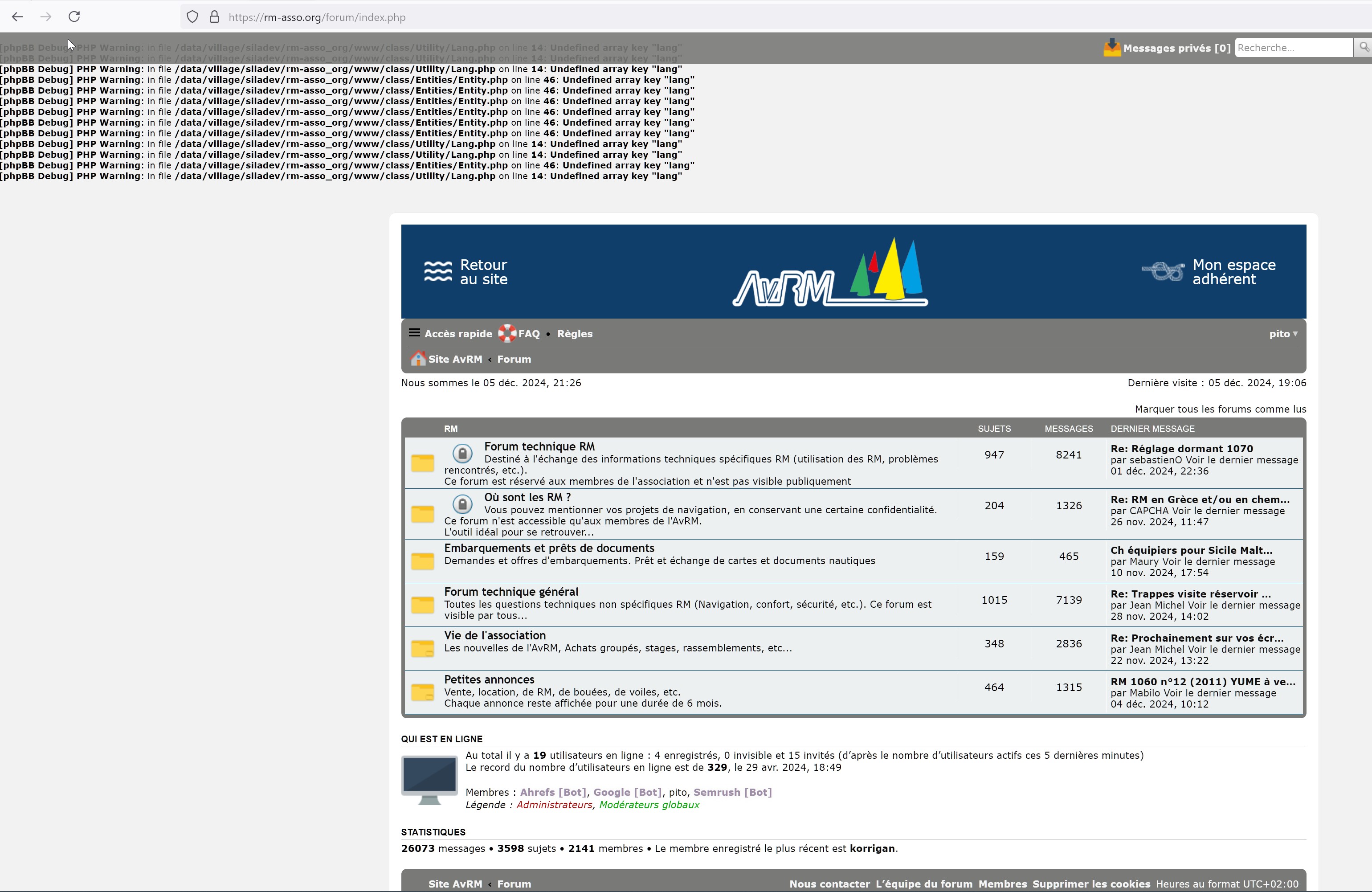 Ceci dit, même si dans l'ensemble, le site fonctionne, j'ai quand même détecté pas mal de points problématiques, d'une importance plus ou moins grande. Je les détaillerai dans un courriel à l'adresse support.site@rm-asso.org. Je signale parmi ce qui me parait gênant le fonctionnement du pont entre le site principal et phpBB, qui fonctionne même moins bien que celui qu'on avait jusqu'à présent (je donnerai des détails). Et aussi l'absence de pas mal de pages/fonctionnalités disparues et pourtant souvent affichées ou très utilisées. Et des problèmes de connexion pour les adhérents et inscrits avec un pseudo comprenant des caractères accentués (il y en a au moins 7)